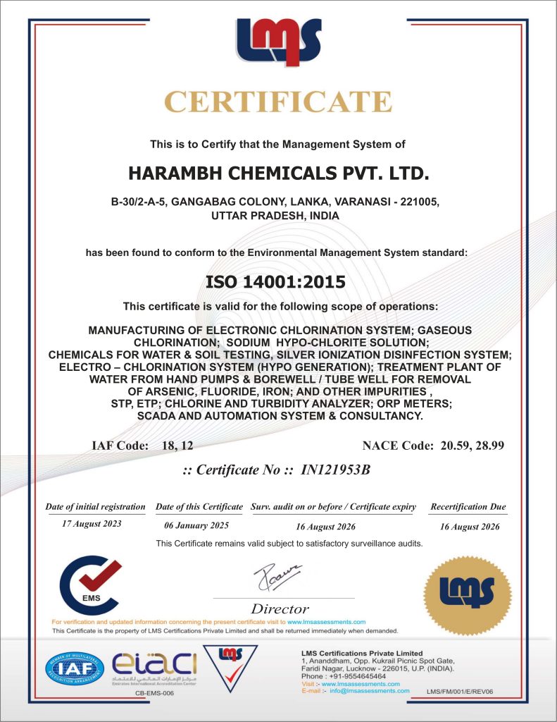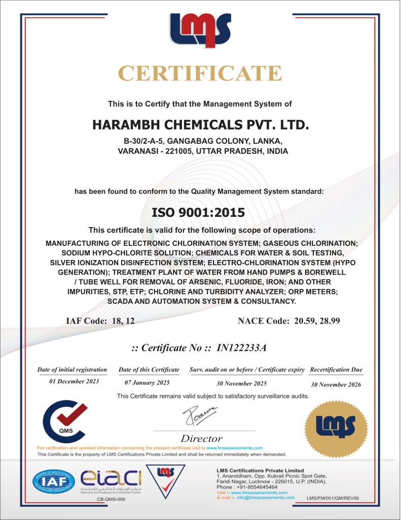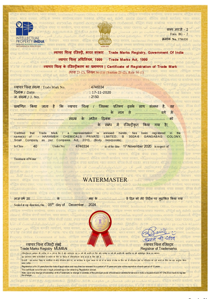 This certificate is proudly presented to Harambh Chemical Pvt Ltd, recognizing their exceptional proficiency and successful completion of advanced training in the field of water and wastewater treatment. As part of Harambh Chemicals Pvt. Ltd., a distinguished company licensed by the CSIR-CMERI (Central Mechanical Engineering Research Institute), [Recipient's Name] has demonstrated a high level of expertise and dedication. Harambh Chemicals Pvt. Ltd. is renowned for its commitment to excellence, with all manufacturing, installation, and designing processes executed by our team of skilled professionals, engineers, and experts. This certification attests to [Recipient's Name]'s adherence to the highest standards and their contribution to delivering innovative, effective water treatment solutions.